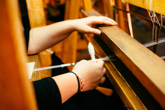 Hands of african man weaving traditional cloth. Male artisan working on textile loom makes ethnic fabric with colorful pattern. Design from Africa.