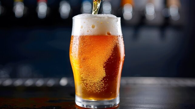 A dynamic, macro shot capturing the perfect pour of a craft IPA into a frosty pint glass