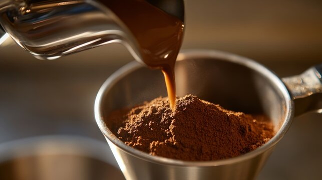 Freshly ground coffee cascading into a portafilter, capturing the essence of artisanal brewing.