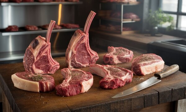 Showcasing premium dry-aged beef collection in a professional aging room with wooden shelves soft studio lighting for culinary enthusiasts