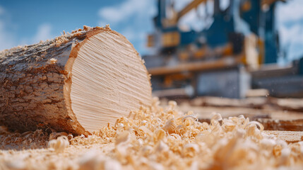 Wooden log resting on sawmill surface, macro perspective with curly shavings around, detailed wood textures, blurred background of saw blades and machinery, artisanal woodworking s