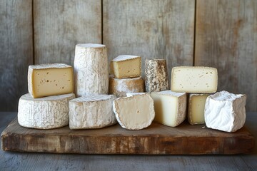 Photo of, A rustic wooden board adorned with an assortment of artisanal cheeses, such as brie