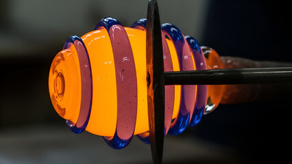 Molten glass glows orange and blue as a glassblower shapes it in a dark workshop. Viscous, radiant texture forms ridges. Perfect for artisanal craft promotions, industrial process visuals,