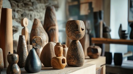 Wooden artisan sculptures displayed on shelf handmade craftwork home decor natural material warm cozy scene
