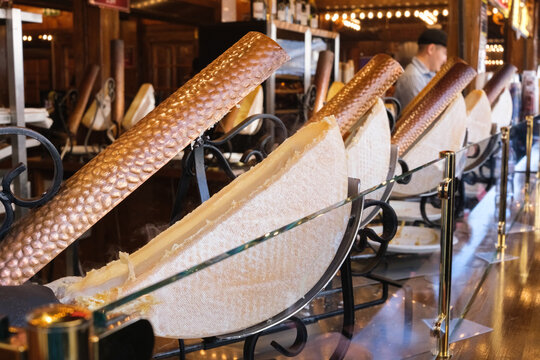 Raclette at a cheese street stall, delicious bite of traditional Swiss food.