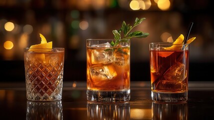 elegant cocktail arrangement sophisticated glassware artisanal spirits moody black background dramatic lighting upscale bar ambiance