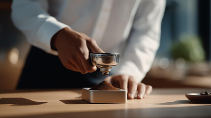 A barista tamping espresso grounds with practiced pressure, the friction in the compressed puck determining extraction quality and flavor depth — specialty coffee precision and sensory experience.