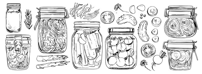 Fermented vegetables. Vector food line drawing on white background. Jars with preserves, sauerkraut, pickles.