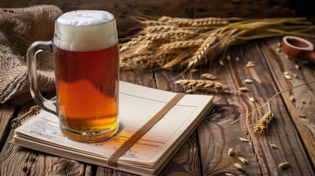 Beer tasting notes: Notebook with beer tasting notes and a glass of beer