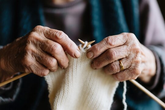 Close-up of elderly hands knitting with wooden needles and cream colored yarn