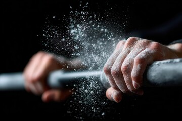 Close-up of chalked hands gripping an Olympic barbell, powder dust exploding into the air