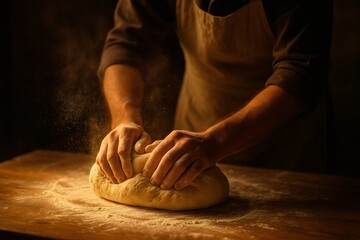 Baker hands kneading fresh dough on a wooden table, preparing homemade bread with flour dustings. Warm, artisanal baking process