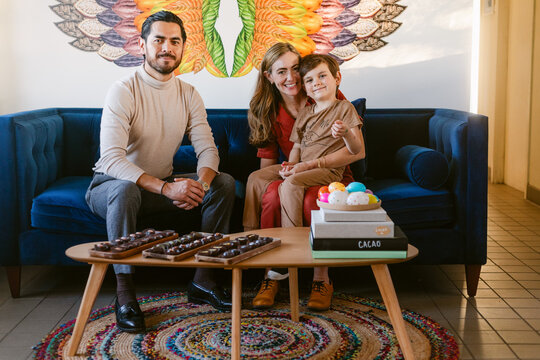 Smiling family of three in shop