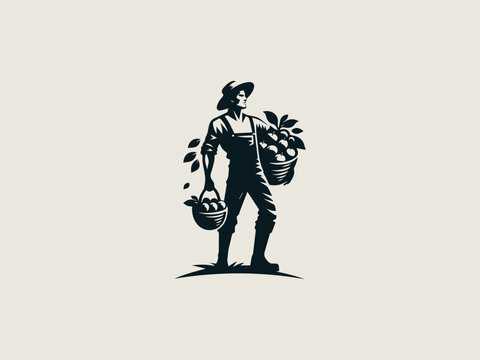 Vintage engraved farmer with fruit basket vector logo for juice brands