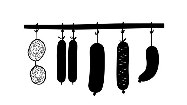 Cured salami hanging on wooden rack with natural lighting creating a rustic atmosphere, showcasing traditional charcuterie craftsmanship and artisanal food preparation techniques.