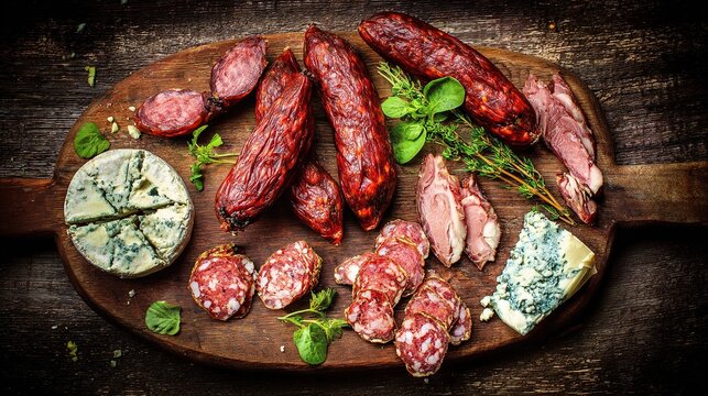 charcuterie. Gourmet selection of cheeses and sausages arranged on a wooden surface, top view. menu design, packaging mockups, designed for food delivery and cloud-kitchen brand materials.