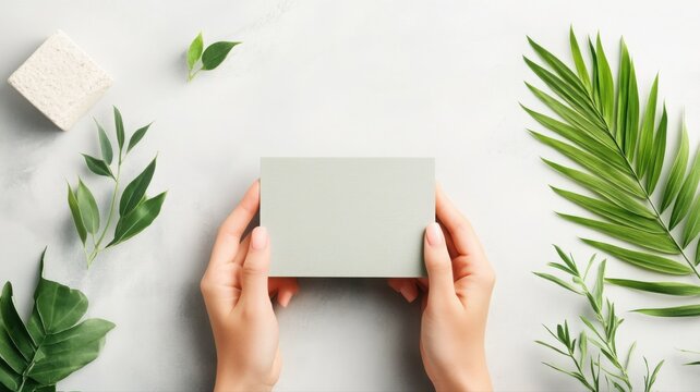 Holding a minimalist business card made from recycled paper with leaf design. Generative AI