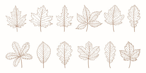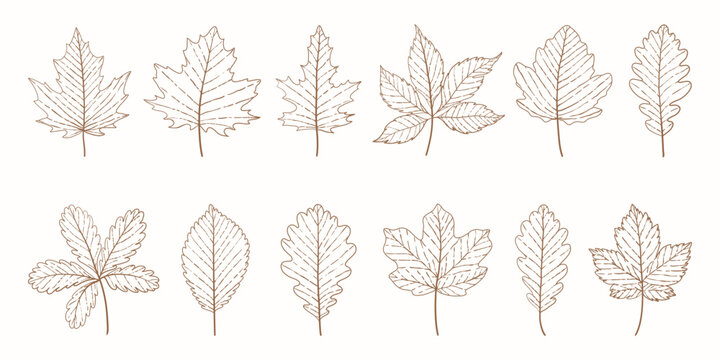 Autumn leaves set. Botanical vintage leaves sketch set. Line art elegant leaves set for wedding invitations. Hand drawn engraved leaves collection. Detailed outline leaves and foliage for print