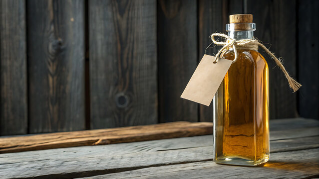 Hand holding a dark glass bottle with two blank cream-colored labels ready for custom branding or product information.