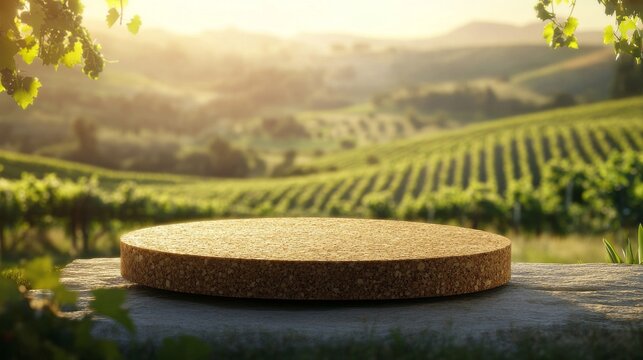 artisanal cork platform, sun-drenched vineyard scenery, sustainable product presentation, golden hour photography, verdant hillside backdrop, eco-conscious display design, serene countryside setting