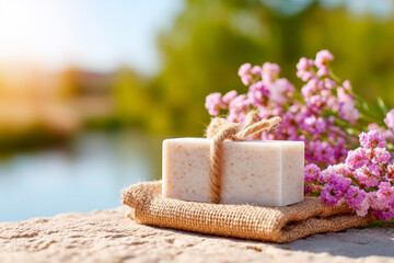 Off white speckled soap wrapped in twine on burlap with dried flowers artisanal bath product