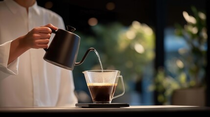 A barista pouring filtered water into a kettle for pour-over coffee, capturing the moment pure water enhances flavor and aroma — specialty coffee preparation, water quality control, and artisanal