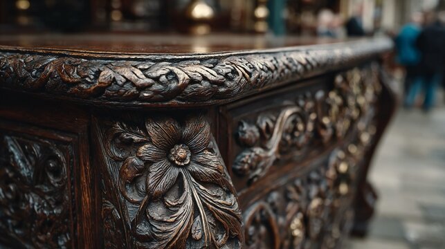 Detailed photo of carved wooden furniture detail with floral motifs and polished surface, highlighting artisanal woodworking, traditional craftsmanship, and antique design.