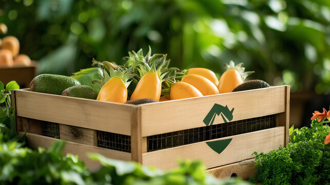 An artisanal wooden box with papayas and tropical fruits, featuring a recycling symbol on the side, nestled among fresh greens and flowers at a farmer’s market