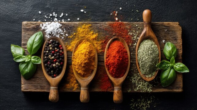 A vibrant arrangement of assorted spices including black peppercorns, turmeric, paprika, and dried herbs on wooden spoons. Fresh basil leaves and salt add a touch of freshness, set on a rustic wooden