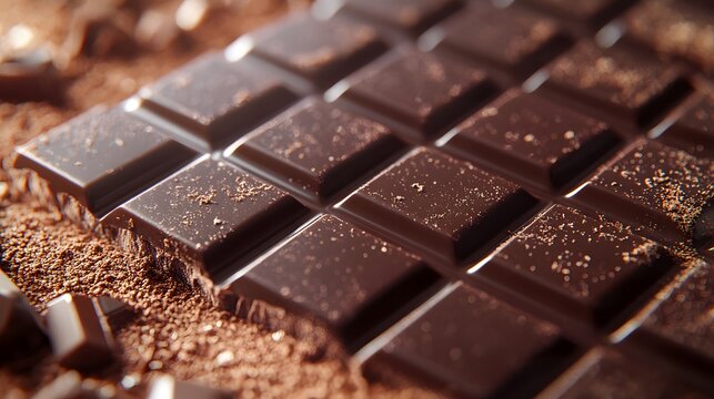 Dark chocolate bar, rich brown color, glossy surface, perfect squares, tempered chocolate, high-quality cocoa, close-up shot, textured detail, gourmet confectionery, indulgent treat.