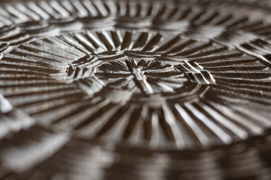 Artisanal Circular Wood Table with Symmetric Texture in Close-up View