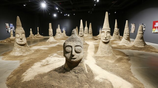 Sand sculptures of serene faces and conical forms arranged in a gallery setting.