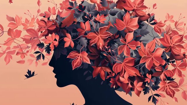 Silhouette with blossoming leaves transitions from side to front view in artistic transformation. Stress awareness day. Mental Health concept