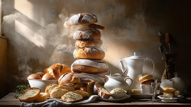 A beautifully styled photograph showcasing a tower of freshly baked bread stacked elegantly, with delicate white porcelain surrounding it, creating a refined and artistic food display.