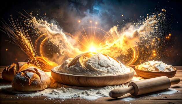 Artistic Flour Explosion Composition with Breads and Baking Tools on Wooden Surface with Lighting Effects