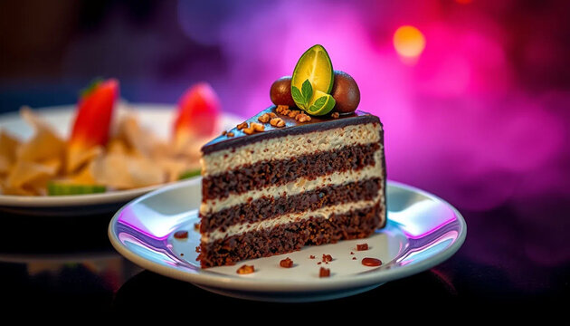 Elegant strawberry cake slice illuminated by dynamic pink and blue neon glow.