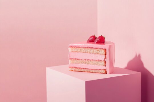 A slice of strawberry cake with creamy texture and shiny glaze on a podium against a minimalist pink background