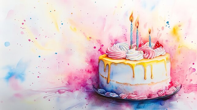 A beautifully illustrated cake with colorful icing, topped with candles, and set against a vibrant, splashed watercolor background.