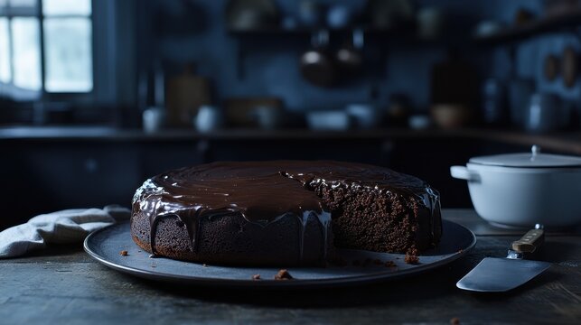 Rich Ganache Cake Slice in Moody Kitchen Lighting