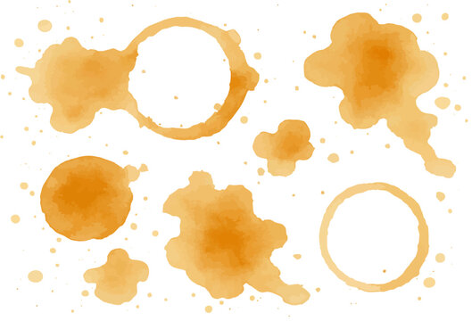 Abstract watercolor coffee stain art featuring multiple circular stains and splashes in warm brown tones on a white background, ideal for creative projects, textures, or artistic designs.