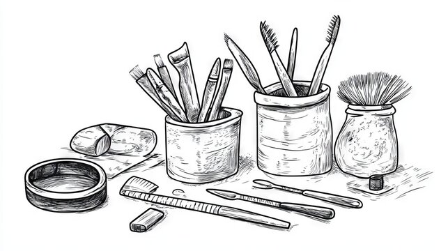 monochrome vector illustration of crafting supplies, detailed cross-hatching texture, continuous line drawing, artistic pen and ink style, minimalist composition