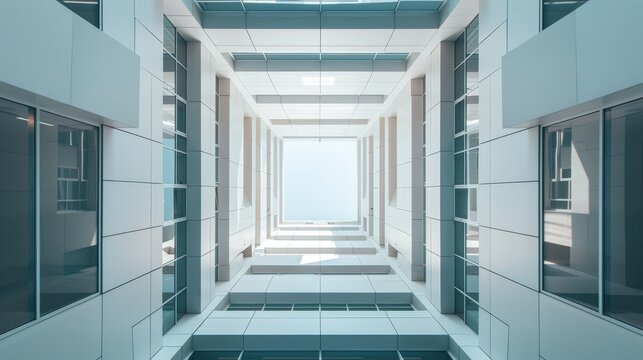 Geometric Art of a hospitals architecture, focusing on the symmetrical design and structured environment in a modern, geometric abstraction theme