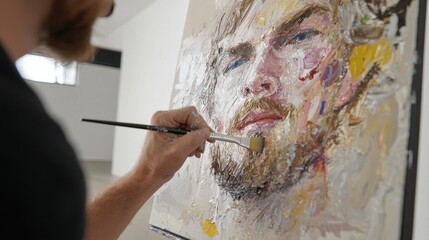 A person paints a colorful portrait of a man, showcasing expressive brushwork and texture in an artistic studio setting.