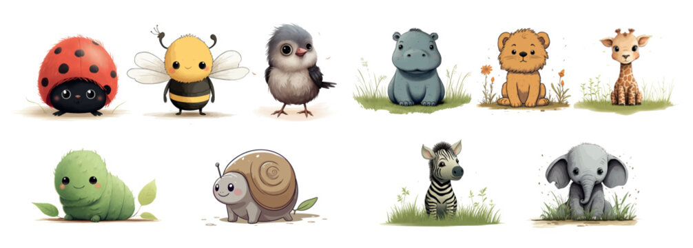 dorable Illustrated Baby Animals: Ladybug, Bee, Bird, Hippo, Lion, Giraffe, Caterpillar, Snail, Zebra and Elephant
