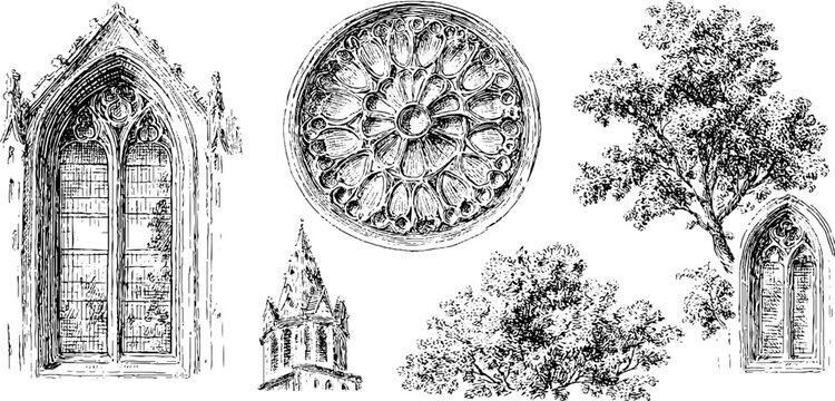 Intricate black and white engraving set featuring gothic architecture and nature elements