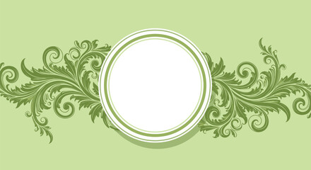 Green circular frame flanked by ornate scrollwork and flourish patterns of leaves and vines for a classical decorative aesthetic.