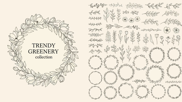 Elegant Hand-Drawn Wreath and Floral Elements Collection for Decorative Designs