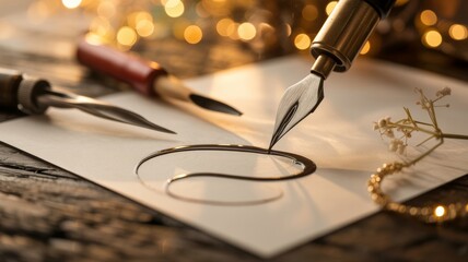 Elegant fountain pen writing a decorative flourish on paper with warm artistic lighting
