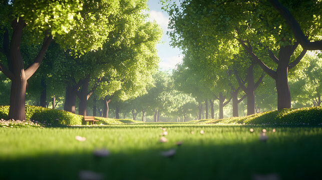 a low poly 3d animated setting of a park with no people, only trees and grass. minimal detail.