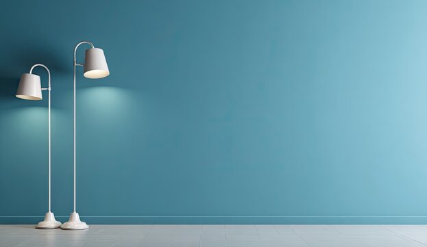 Modern interior with two white floor lamps against a teal wall, casting soft glow